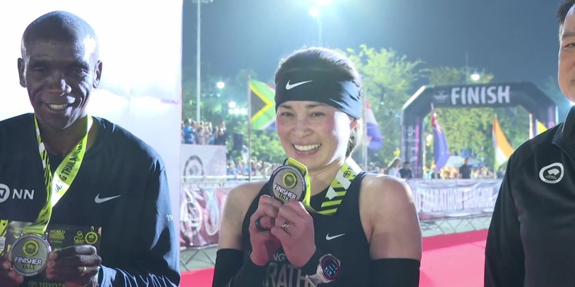 Her Majesty Queen Suthida Bajrasudhabimalalakshana completed the 21.1-kilometer half marathon distance at the “Amazing Thailand Marathon Bangkok 2025” on Sunday, running alongside legendary Olympian Eliud Kipchoge.