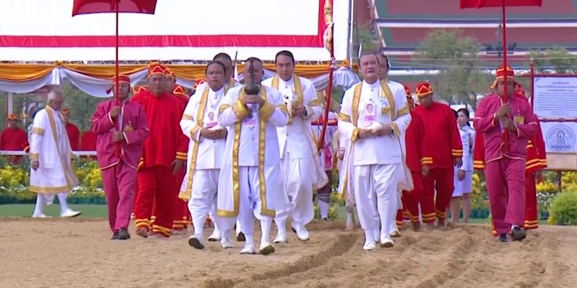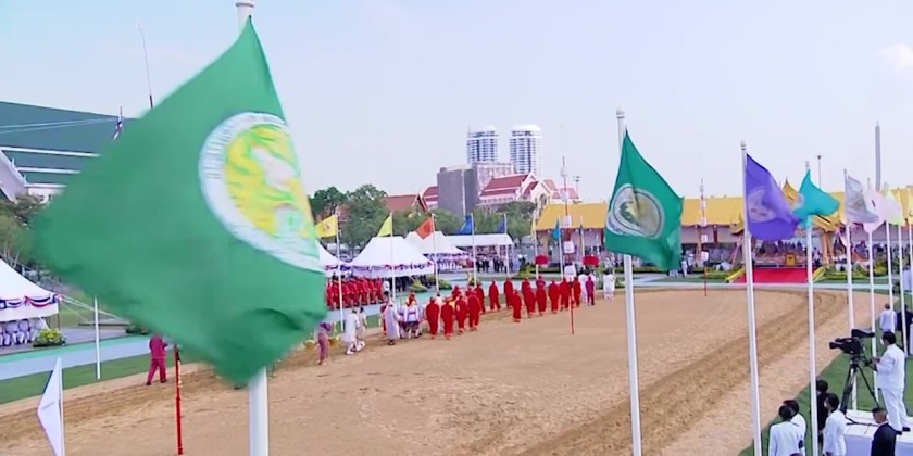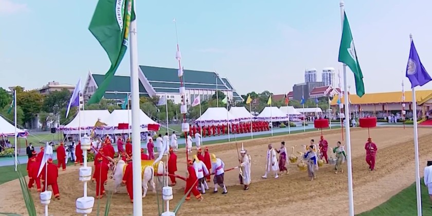Their Majesties the King and Queen presided over the annual ritual, held between 8.09AM and 9.09AM local time at Sanam Luang Park. Agriculture Permanent Secretary served as the “Lord of the Plough”. In that role today, from the three lengths of folded cloth offered, he chose the about 12.5cm long, which was interpreted as meaning that there will be sufficient water, bountiful rice yields and abundant food this year.