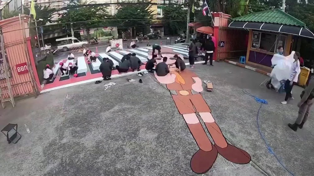 Thailand is trying out a creative solution to reduce the number of pedestrian accidents by painting on 'levitating' zebra crossings that force drivers to take a second look and stop. The painting, done by some 50 students and volunteers, plays on the perspective view of elevated zebra stripes over the road surface, and is located by the main entrance of the school.