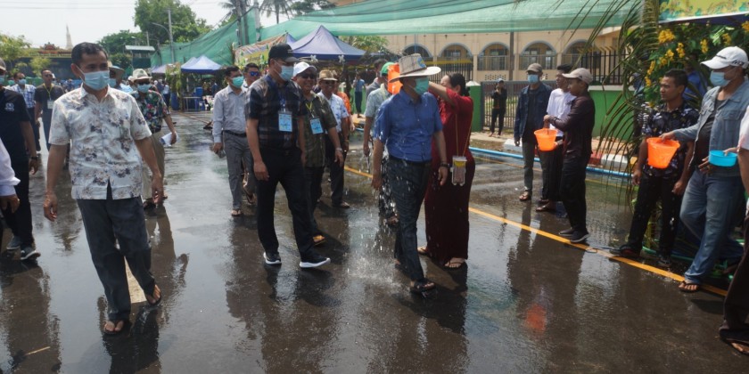 Bago Region Chief Minister U Myo Swe Win and the Regional Ministers took part in splashing water at the central pandal, walking Thingyan and giving charity feasts in Bago on 14th April, Thingyan Akya Day.