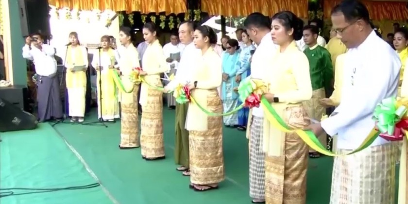Azer that, the Region Chief Minister, U Aung Naing Thu, the Commander of the Yangon Region Command, the Region Minister for Development Affairs and the Mayor of Yangon City cut the ribbon to officially open the Yangon City Maha Thingyan Pavilion.