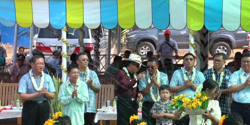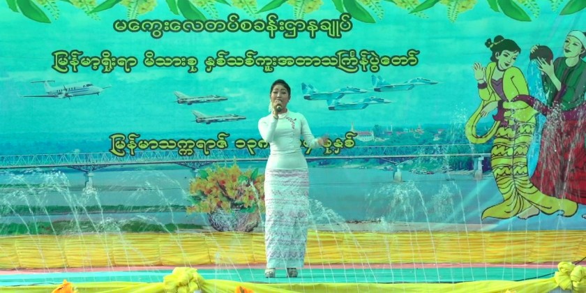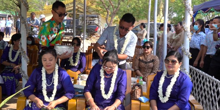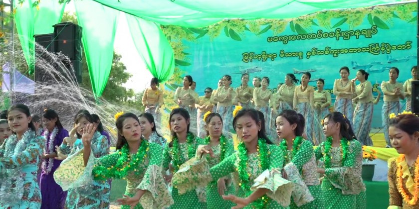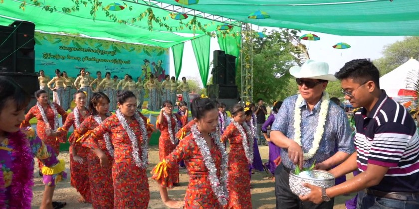 After formal opening of the pandal, the Chief Minister and party sprinkled the scented water to the members of dance troupes who perform the Thingyan dance.
