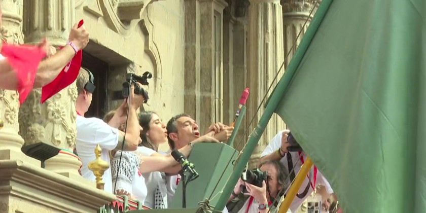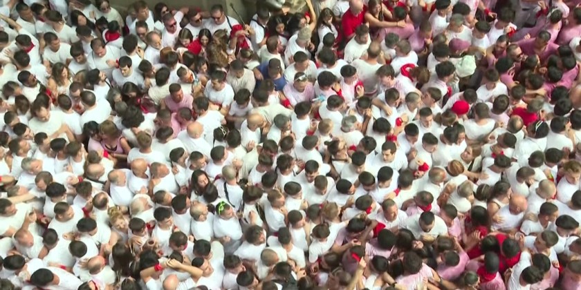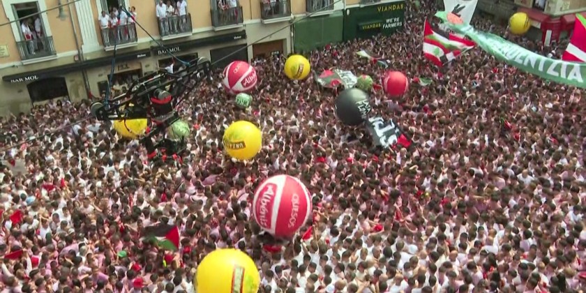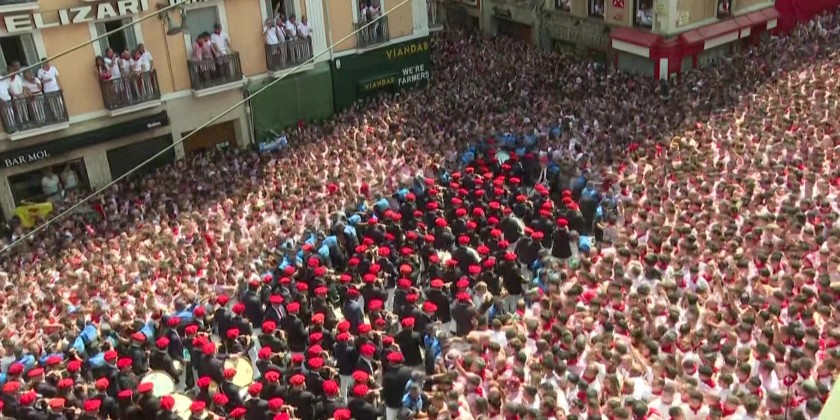 A huge crowd gathers in central Pamplona, northern Spain, for the "Chupinazo" (rocket launch) marking the official start of the San Fermin Festival. Thousands of people every year attend the week-long festival and its famous bull runs in which six bulls are released at 8:00 A.M. every day starting July 7.
