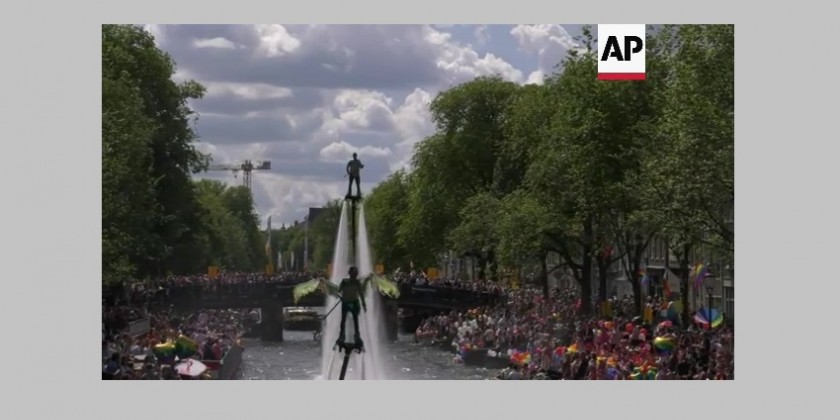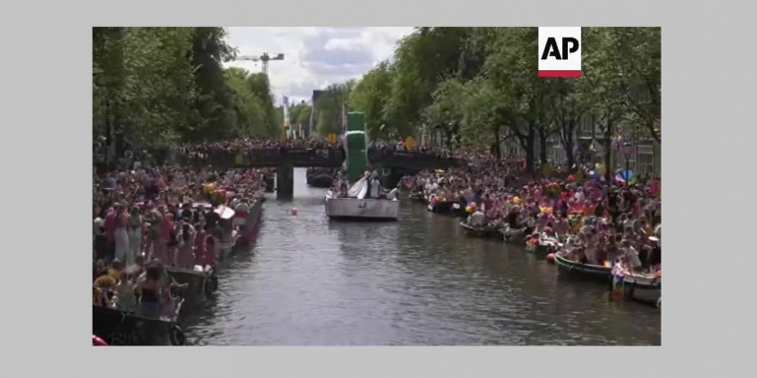 Hundreds of thousands of spectators lined Amsterdam's historic canals Saturday to celebrate Canal Parade. A fleet of 80 brightly decorated boats was packed with revellers waving rainbow flags, balloons and umbrellas.