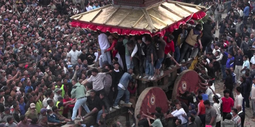 Tens of thousands of people gathered in Bhaktapur to mark the first day of Biska Jatra, pulling a traditional wooden chariot built in the pagoda-style to welcome the Nepali New Year.