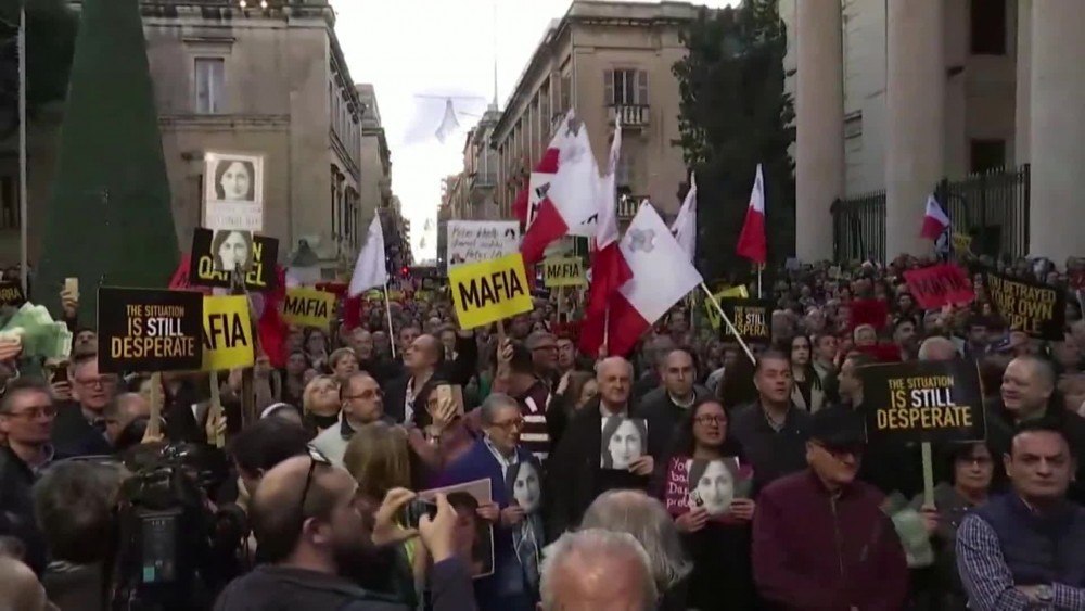 Thousands of protesters waving Maltese flags gathered outside Malta's Courts of Justice on Sunday calling for the immediate resignation of Maltese Prime Minister, Joseph Muscat. Screaming loudly "mafia" and "out now", protesters threw fake money in the air, holding portraits of murdered journalist, Daphne Caruana Galizia. Calls for Muscat to step down have grown after one of Malta's richest men, Yorgen Fenech, has been charged with complicity to murder in the investigation into the car bomb killing of anti-corruption journalist Caruana Galizia on Saturday.