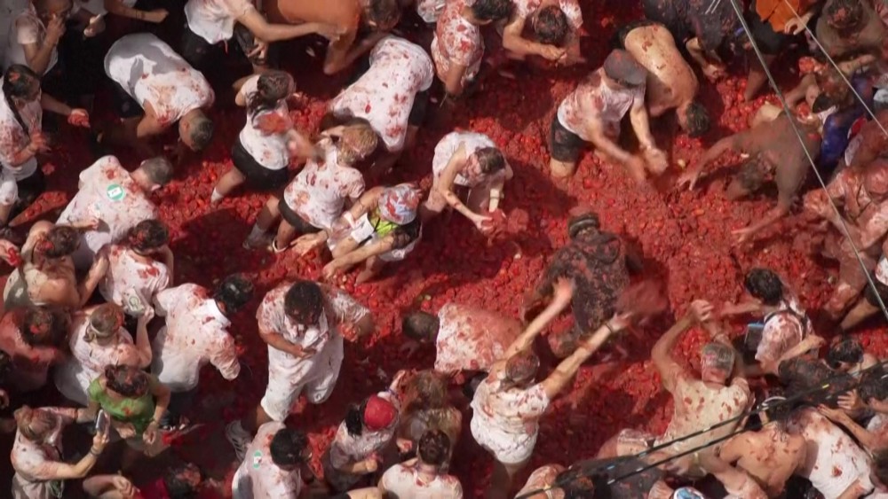 The annual festival comes about a year after devastating floods hit the region, which was why this year's slogan was 'tomaterapia,' or 'tomato therapy.'