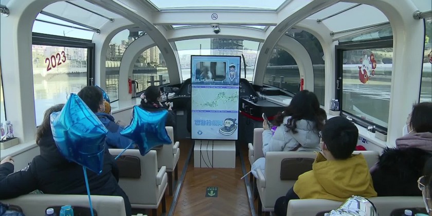 Visitors listen to audio explanations and enjoy the scenery on both sides of the Suzhou Creek through the 270-degree panoramic skylight. The Creek cruise was officially put into operation on December 15 last year. Tourists can not only enjoy the beautiful scenery on both sides of the Suzhou Creek but also savor the unique splendor of Shanghai-style through historical architectures as well as old factories, and pursue those entrepreneurs’ footprints.