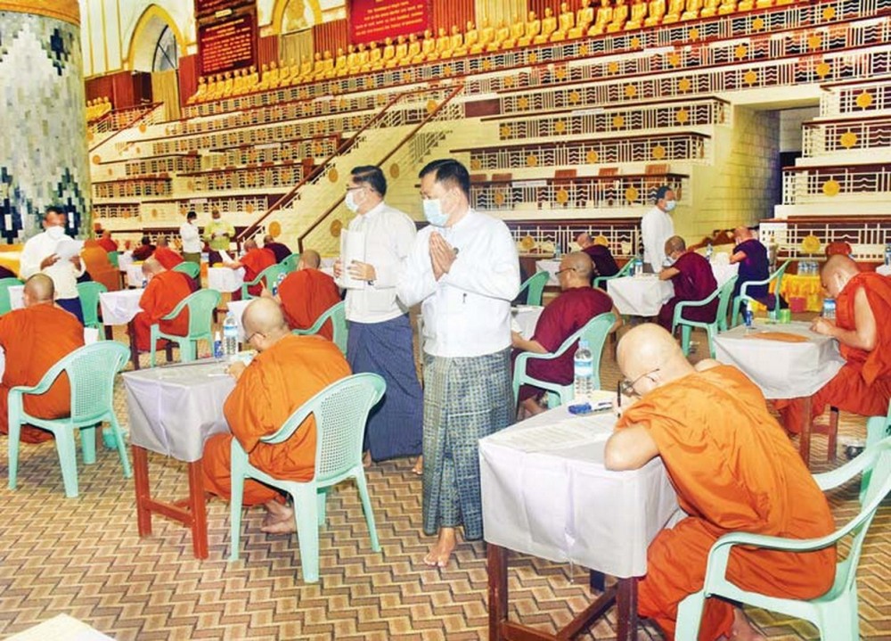 The event was attended by Deputy Minister for Religious Affairs U Aye Tun on behalf of the Union Minister, Chairman of Yangon Region Administration Council U Hla Soe, Commander of Yangon Command Maj-Gen Nyut Win Swe and responsible officials. First, the congregation led by deputy minister U Aye Tun received the Five Precepts from Chairman of Tipitakadhara Tipitakakovida Selection Board Hlinethaya (လႈိင္သာယာ) Township Sasana Gonyee Monastery Sayadaw Abhidhaja Maha Rattha Guru Bhaddanta Pannissara Bhivamsa, and listened to the Parittas recited by Members of the Sangha. Afterwards, Chairman Sayadaw of State Sangha Maha Nayaka Committee Abhidhaja Maha Rattha Guru Abhidhaja Aggamaha Saddhammajotika Bamaw Sayadaw Dr. Baddanta Kumarabhivamsa delivered an Saraniya Ovadakatha, followed by the deputy Minister supplicating religious matters and offering of offertories and rice to the Sayadawgyis. Then, the congregation listened to the sermon delivered by Yangon Region Thanlyin Minkyaung Pahtamapyan monastery Sayadaw Agga Maha Pandita Aggamaha Saddhammajotikadhaza Bhaddanta Candima Bhivamsa, shared the merits they gained and the ceremony was concluded.