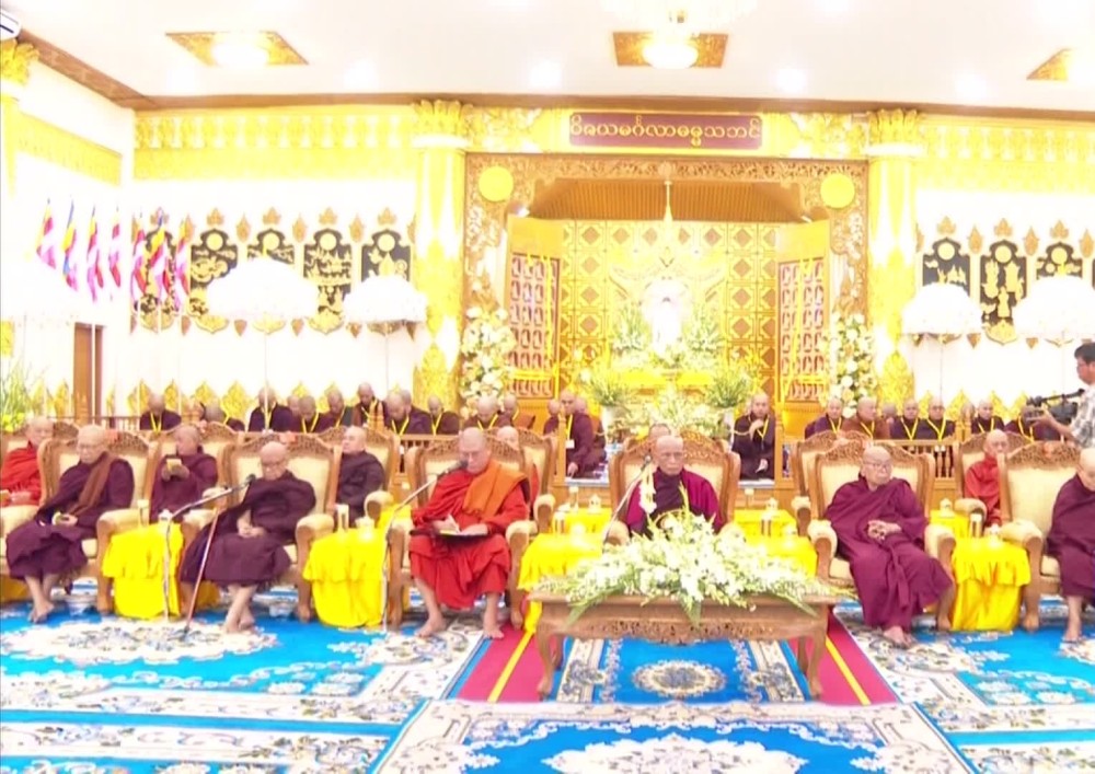 First, the congregation received the Five Precepts from Vice Chairman of Ovadacariya of Tipitakadhara Tipitakakovida selection examination board Presiding Sayadaw of Moegaung Monastery, Hinthada Township, Bhaddanta Suddhamasara Bhivamsa. Afterthat, the Chairman Sayadaw of the State Sangha Maha Nayaka Committee delivered an Ovadakatha , followed by a supplication of religious matters by the Union Minister.