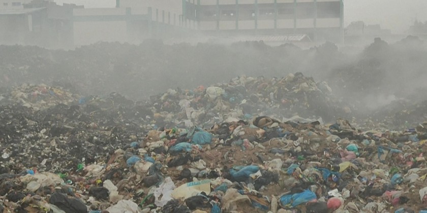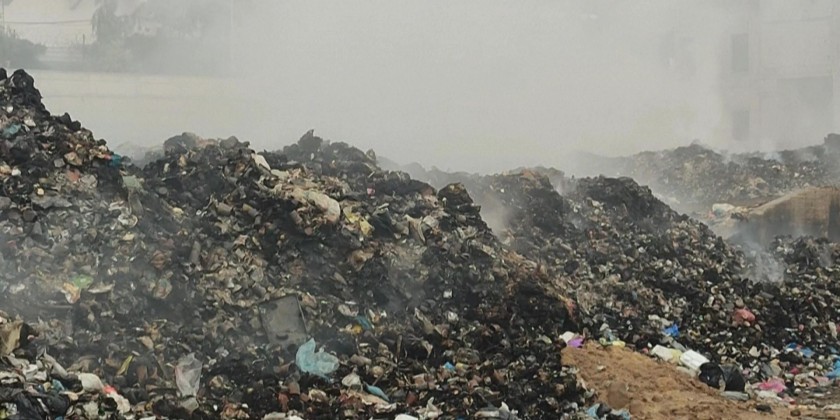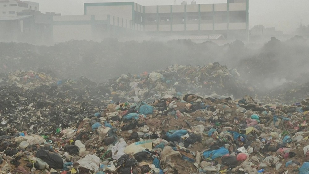 Thousands of tons of smoldering garbage arranged in random areas are stuck in central Gaza City.