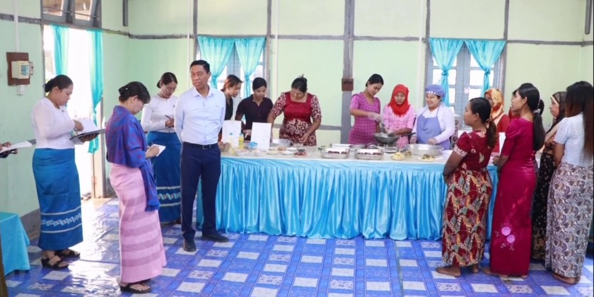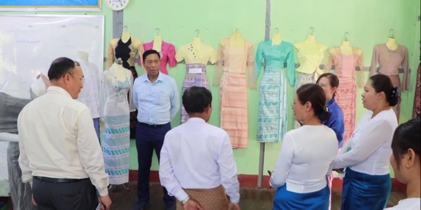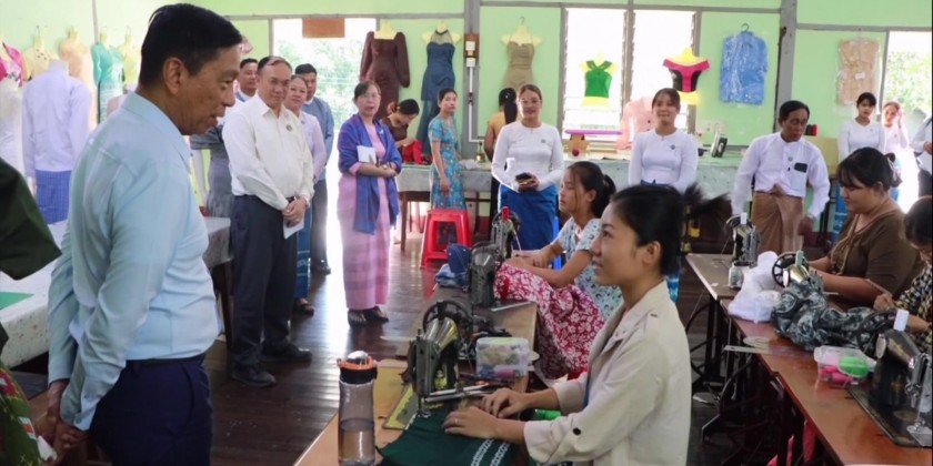 The Union Minister and party also visited the Pathein Home-based Vocational Training School, where they observed women attending the vocational courses.