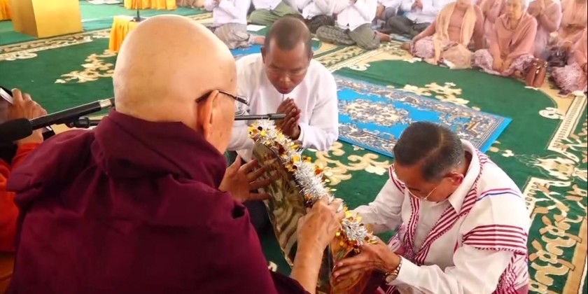In the subsequent ceremony for merit sharing, the congregation recited Namo Tassa three times and received five precepts delivered by the members of Sangha.