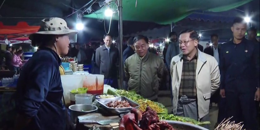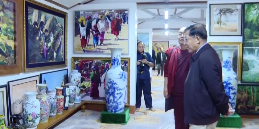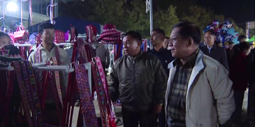 At night, the Acting President and party visited Maha Myat Muni Pagoda and offered fruits, water, flower and light to the Buddha Image. The Acting President also donated cash for all-round renovation. They then attended the 42nd anniversary Lahu New Year Festival at the State Ground. They viewed the sales of traditional foods, clothes and utensils, cordially greeting the visitors, Lahu ethnic people and local ethnic community.