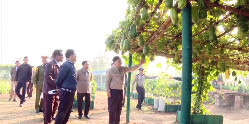 The Executive Chief and prty later visited the model vegetable plantation in Naung Yar (A) Ward, and viewed the thriving perennial crops and vegetables. At the State Government Hall, the Executive Chief attended the ceremony to honour the security force members.