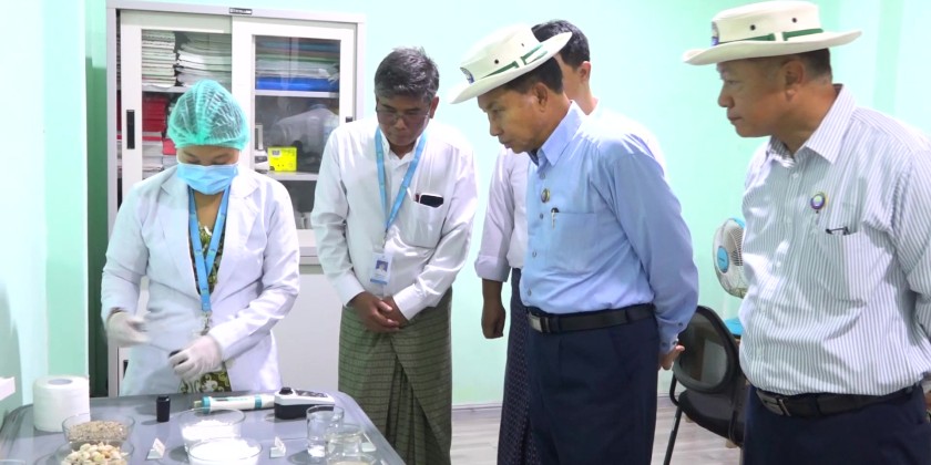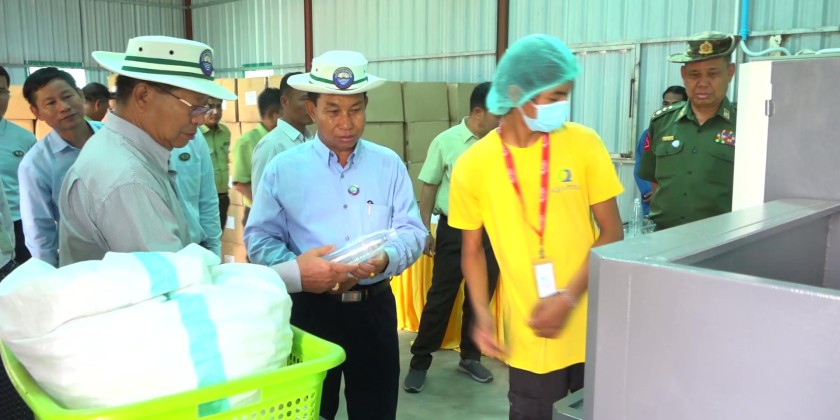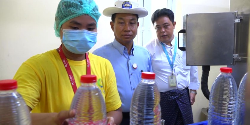 They toured the Aqua Pura water purification plant in Thalawaddy Ward, which produces 10 million gallons of clean water daily, using HDPE pipelines and lamella technology. The Chief Minister viewed the treatment process and laboratory setup. Next, they visited the R Paw water purification factory, which produces 2,000 one-liter bottles per day, and viewed the production and packaging stages.