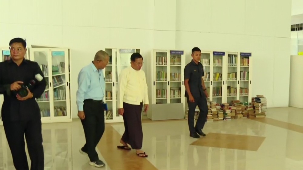 The Prime Minister inspected the library building and displays in the library including the collection of Alinka Kyaw Swar Takkatho Myat Thu, Electronic Library and Reading Room, Win Zin Min Raja Hall, book shelves, Palm Leaf and Writing Tablet Room, as well as the damages in the building.