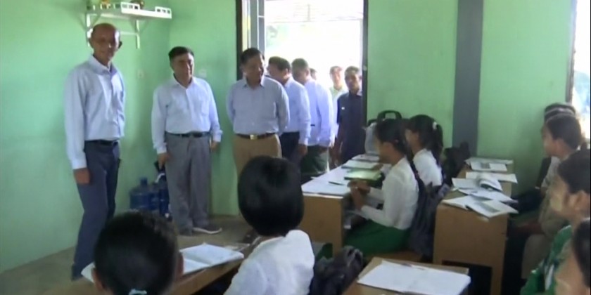 At Asone Zee Kone Village Basic Education Primary School, they encouraged the students learning at the classrooms and members of Myanmar Police Force and Fire Brigade, participating in the cleaning activities. The Prime Minister and party later inspected the progress of Bailey Bridge and the approach road of Nawin Creek Bridge (Asone).