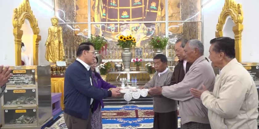 In the morning of 29th January, the Union Minister and Chief Minister visited Shwe Phone Pwint Pagoda in Taunggyi Township, oversaw the offering of gold foils to the whole body of pagoda and new golden umbrella hoisting process and donated cash assistance.
