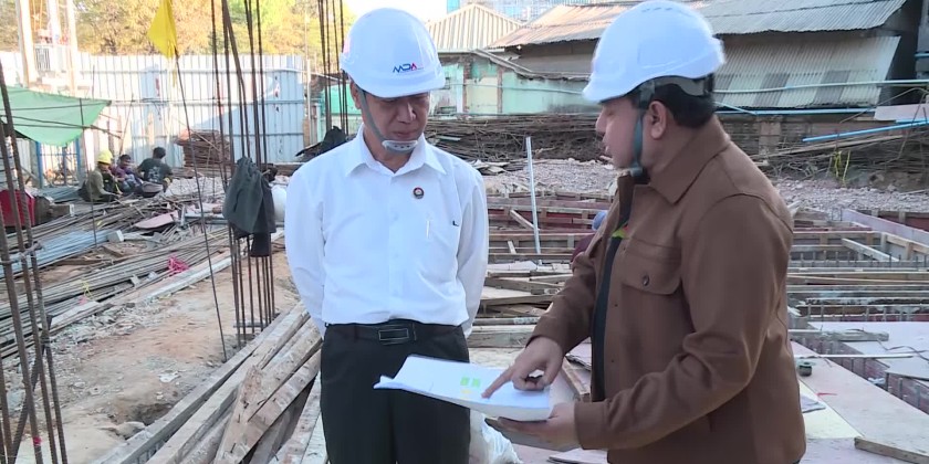 On arrival at the 6-storey Reinforced Concrete building construction site of Thu Mingalar Market ( Nyan Taw Market) in Ward 2, the Chief Minister inspected the completion of the construction process and arrangements to implement drainage system and coordinated necessities.