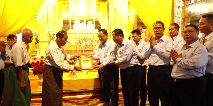Next, they paid homage to Inle PhaungDawOo Buddha Image and offered flower, water, gold foils and cash while observing the renovation of pagoda affected by earthquake. Later, they visited Cooperative Accounting Vocational Training School in Taunggyi where they met with the principal, teachers and students and inspected the completion of repair of earthquake affected buildings.