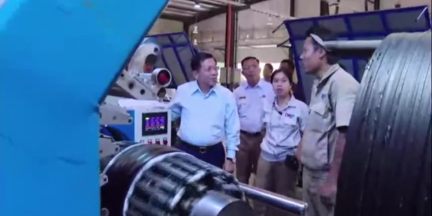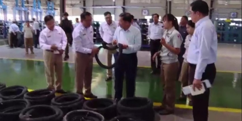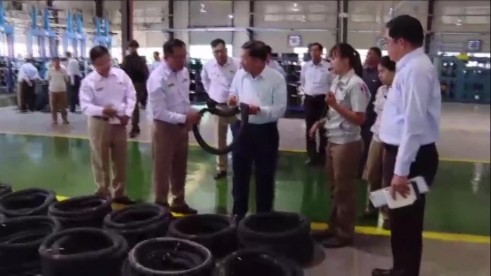 During the tour of the workshop in the factory, the Prime Minitster observed the production process of tyres and inner tubes and quality control measures. In the meeting hall, the MEC Chairman General Nyo Saw and the Factory Manager reported on the operation process of the factory, boosting production of tyres to meet the local demand and efforts for market expansion.