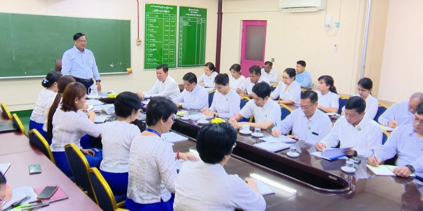 On October 26, Union Minister for Industry Dr. Charlie Than visited the Ceramic Wares Factory in Hlaing Township, Yangon where he received reports on the factory's operations in the meeting hall.