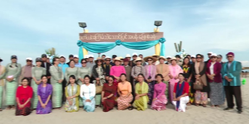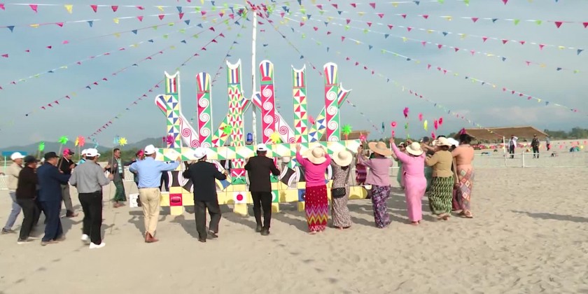 Afterwards, the State Chief Minister and wife, Chief Justice of State High Court, State Government Ministers and their wives, departmental officials, members of District and Township Administration oversaw the setting up traditional food shops, mini beach tents, colorful umbrellas, flower decorations, photo booths and the areas where the sport grounds of football, volleball and Sepak takraw are going to be built and participated in Manaw dance in the jublication of Manaw ground together with the visitors.