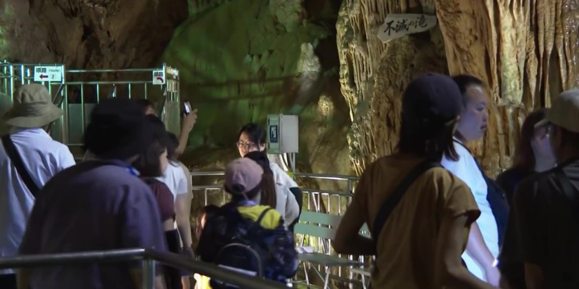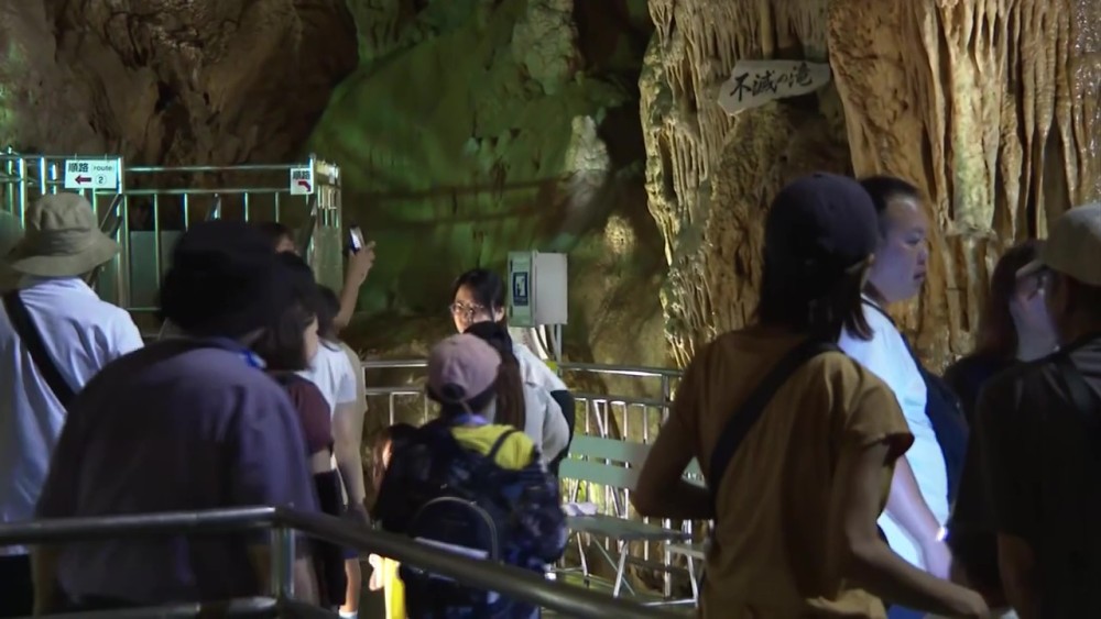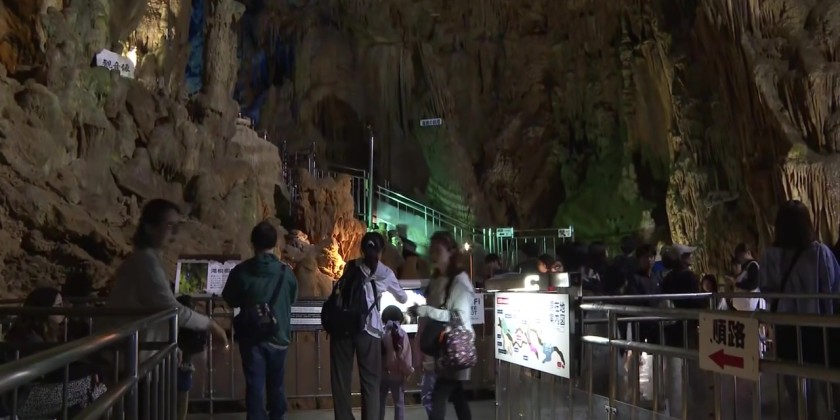 It draws many tourists in summer due to the inside temperature of around 15 degrees Celsius all year. About 600 meters of the cave, which has a total length of over 4 kilometers, is open to the public. An official said the number of visitors to the cave in July was up 10 percent compared to the same period last year due to intense heat. Up to 5,000 visitors per day are expected during the Bon holiday period.