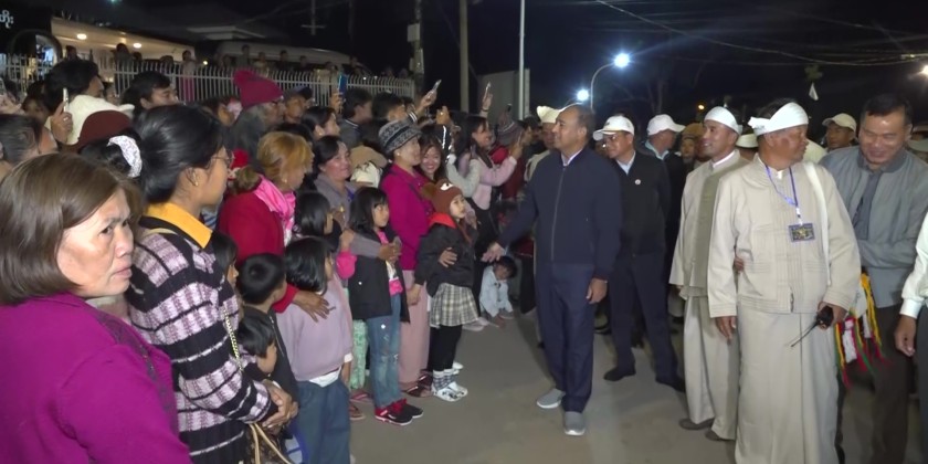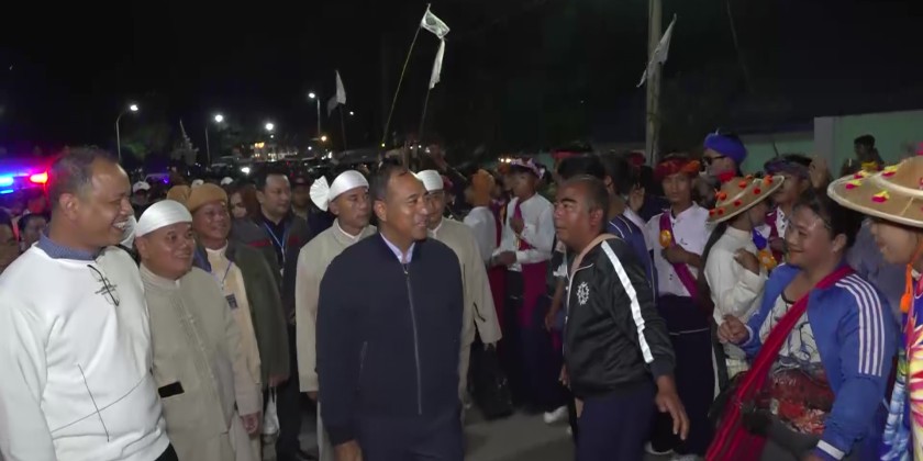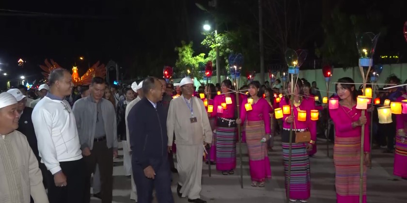 On the evening of November 5th at 8 PM, Shan State Chief Minister U Aung Aung and his wife, accompanied by officials, warmly greeted local ethnic attendees and visiting festival guests who were parading with creative designed candle-lit lanterns during the opening ceremony of the 20th Kalaw Township-Wide Maha Tazaungdaing Traditional Mee Shaw Daing or firework pole festival and the procession of Mee Kyar San or creative designed candle-lit lanterns. They observed and encouraged the procession.