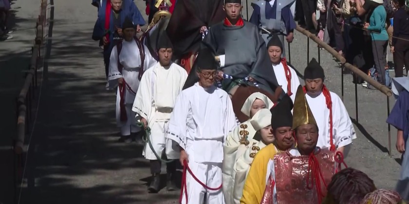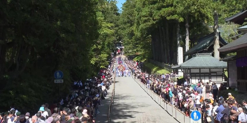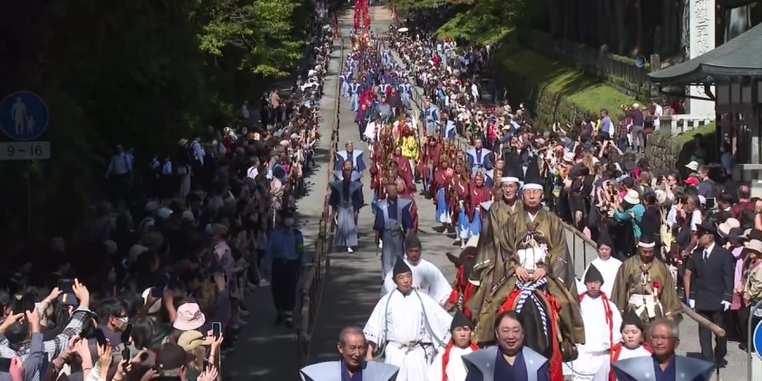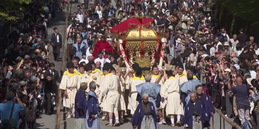 The event reenacts a procession for transferring the remains of Tokugawa Ieyasu, the founder of the Tokugawa shogunate that ruled Japan from the 17th to late 19th centuries. Visitors watched intently as a portable shrine weighing more than 800 kilograms was carried by around 50 people. The shrine honors Tokugawa Ieyasu.