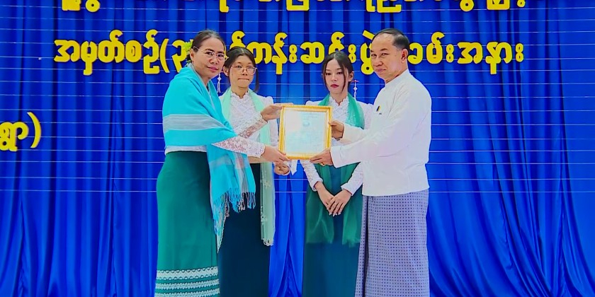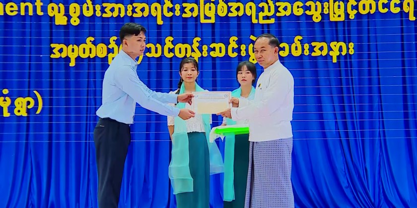 Following this, the Chief Minister U Myat Kyaw presented certificate of honor to the Rector of the University of Computer Studies (Monywa), Dr. Soe Soe Khaing. The Chief Minister also presented honorary certificates and cash awards to the trainees who achieved first, second, and third place in the training.
