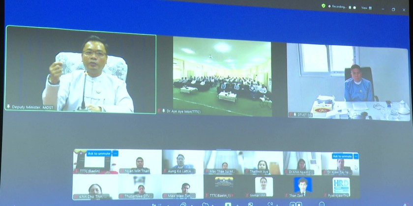 Deputy Minister for the Ministry of Science and Technology Dr. Aung Zeyya, attended the opening ceremony of the EV Mechanics Training (1/2025) via video conference on August 5. The ceremony is being held in a hybrid format at the Technology, Vocational, and Teacher Training College (TTTC Baelin).