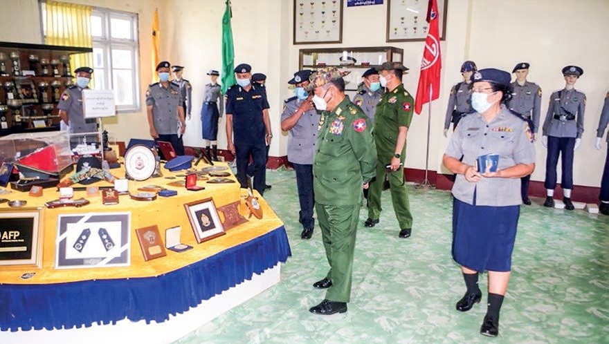 Member of the State Administration Council [SAC] Union Minister for Home Affairs Lt-Gen SoeHtut inspected the Police Officer Training School in PyinOoLwin on Tuesday. There, the Union Minister inspected the E-library and the library, technology gallery, audio lab, demonstration room, trainees’ classrooms, computer lab room, school museum, four-storey classroom under construction, officers’ mess and the trainees’ training in tactical subjects. During the inspection, the Union Minister said that trainees should be trained to use the E-Library and library as the main place in teaching subjects.