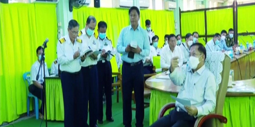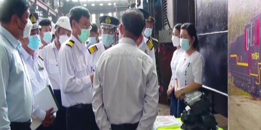 Union Minister for Transport and Communications Admiral Tin Aung San and Managing Director of the Myanma Railways Thura U Aung Myo Myint reported on a brief history of the factory, its missions and visions, maintenance capacity, upgrade of locomotive power, manufacturing of parts, major maintenance of steamed locomotives and test running and capacity enhancement for staff.