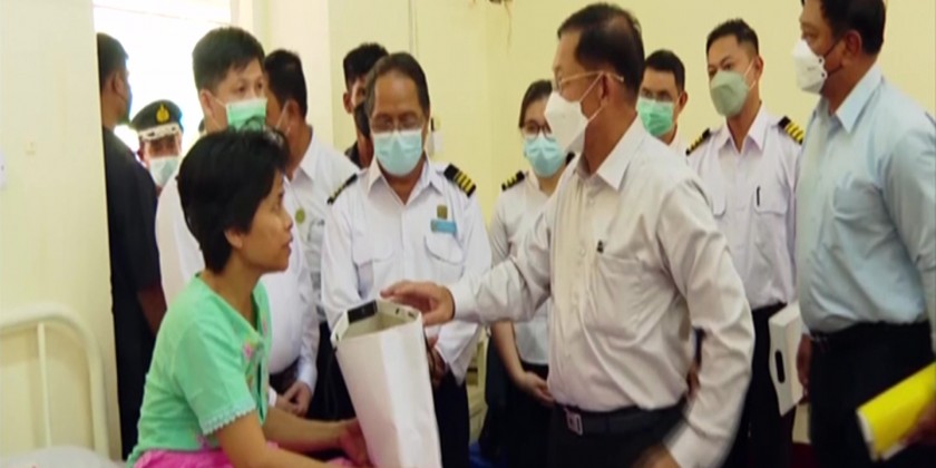 At the Insein Railway Hospital, the Senior General heard reports on daily healthcare services for staff and families, retired staff and local people and the requirement of health staff. There, the Senior General comforted patients and gave foodstuffs.