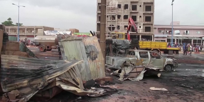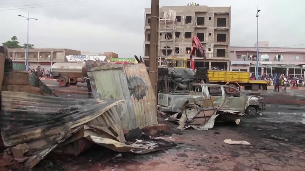 A fuel tanker exploded during a traffic accident in the centre of Mali's capital Bamako on Tuesday. Six people were killed and 46 others wounded, an emergency response official said. The tanker swerved out of the way of a motorcycle, lost control, crashed on its side and exploded, a witness told Reuters. The witness said the flames reached onlookers, who ran to put themselves out in nearby gutters. There are no suggestions that the accident had any link with Islamist groups who carry out attacks in the West African country.