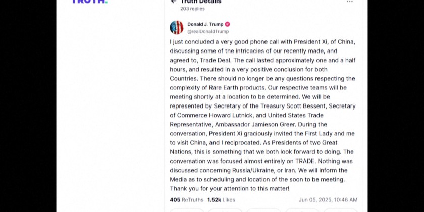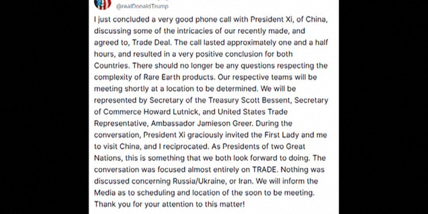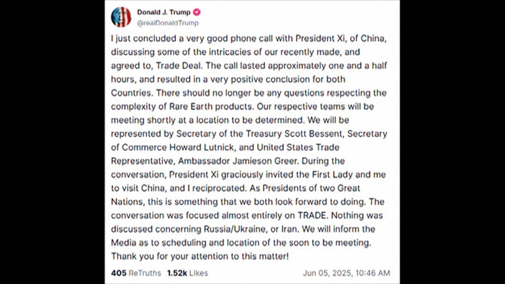 He added that they resolved the "complexity" surrounding the issue of rare-earth products. Chinese state-run media said the call happened at Trump's request. It added that Xi told him to back down from trade measures that have shaken the economy. The two sides had been raising tariffs on each other before agreeing in May to a 90-day pause. This is the first time during Trump's second term that he and Xi are known to have spoken directly.