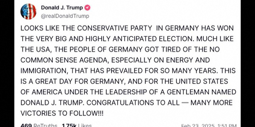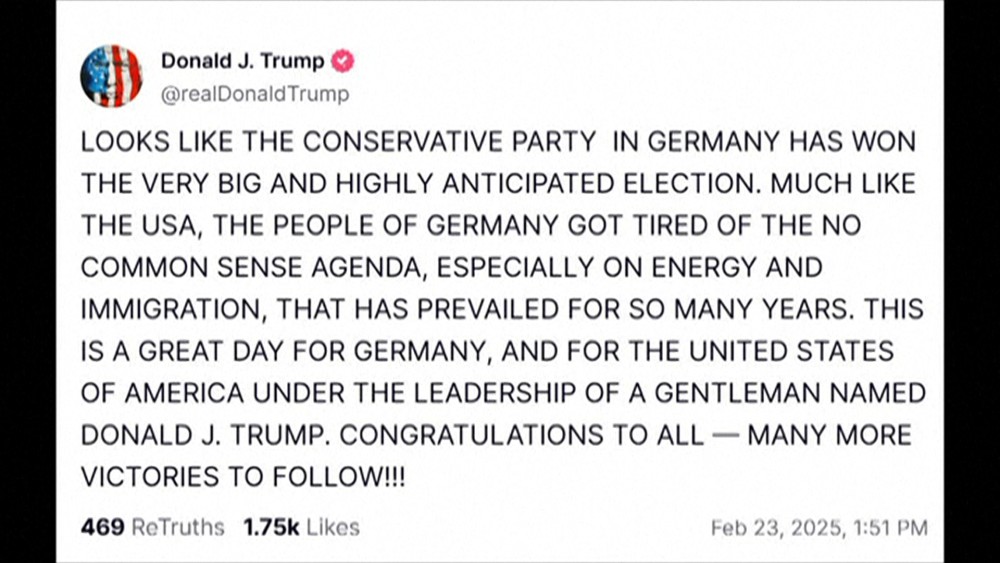 US President Donald Trump on Sunday called the victory of Germany's major conservative alliance "a great day for Germany, and for the United States. "The conservative CDU/CSU alliance won around 28.5 percent of the vote Sunday, while the far-right Alternative for Germany, strongly embraced by close Trump ally Elon Musk scored a surprisingly strong 20 percent.