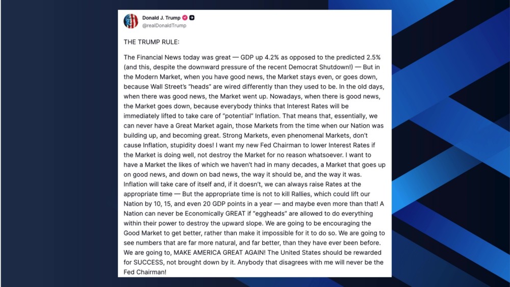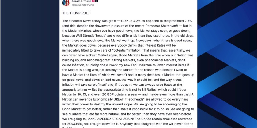 In his post on Truth Social, Trump praised new financial data showing U.S. GDP growth of 4.2 percent, well above forecasts. Trump said the strong performance came despite what he described as the negative impact of a recent Democratic shutdown.