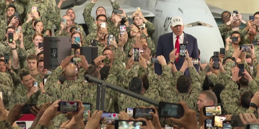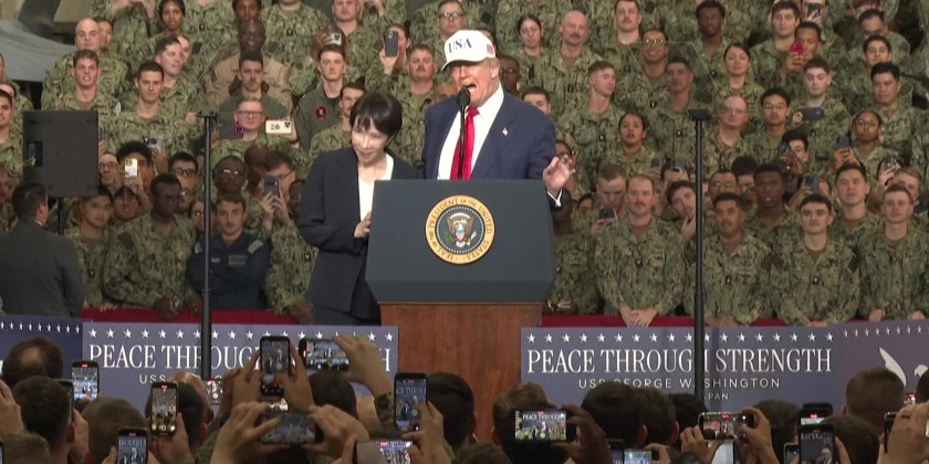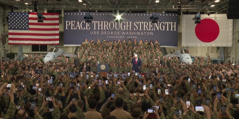 US President Donald Trump delivered a speech to US Navy personnel on board the USS George Washington aircraft carrier at the US naval base in Yokosuka on Tuesday.