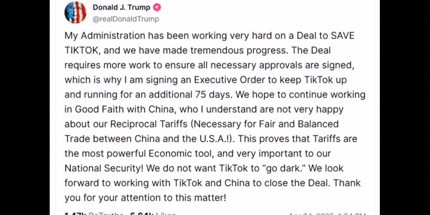 Trump, who took office on Jan. 20, previously signed an executive order to delay the TikTok ban by 75 days "to permit his Administration an opportunity to determine the appropriate course of action with respect to TikTok." That extension was set to expire on April 5.