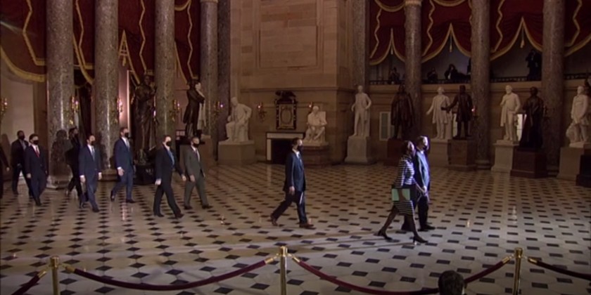 The impeachment case against Donald Trump is heading toward a historic Senate trial. House Democrats carried the sole impeachment charge of incitement of insurrection across the Capitol late Monday, the prosecutors making the ceremonial walk to the Senate. Republican denunciations of Trump have cooled since the Jan. 6 riot. Instead Republicans are presenting a tangle of legal arguments against the legitimacy of the trial and questions whether Trump's repeated demands to overturn Joe Biden's election really amounted to incitement.