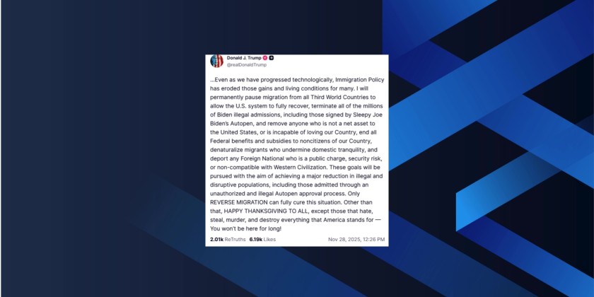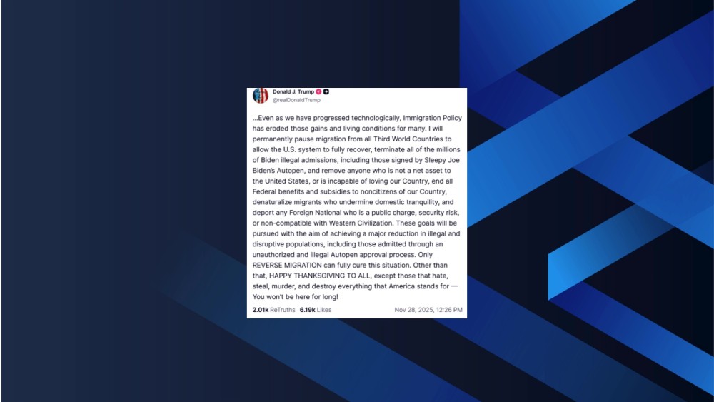 U.S. President Donald Trump published a statement on social media saying that he will permanently pause migration from all Third World Countries to allow the U.S. system to fully recover.