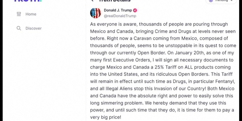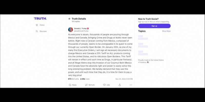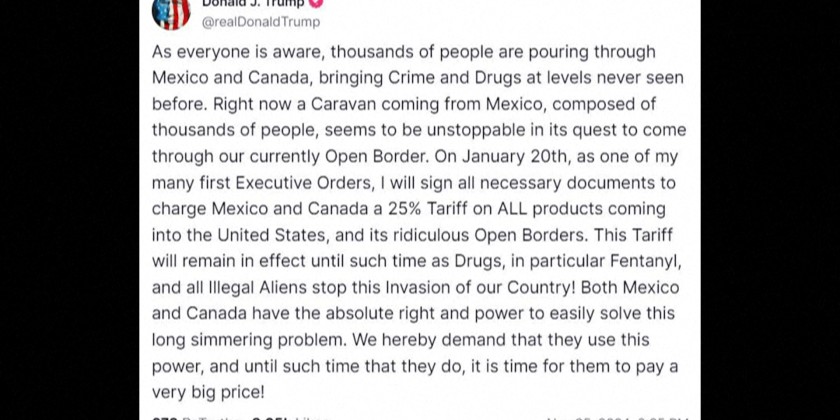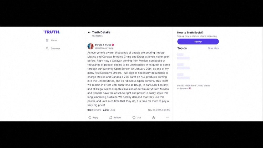 U.S. President-elect Donald Trump vowed on Monday to impose a 25 percent tariff on all imports from Mexico and Canada as one of his first actions upon becoming US president in January. Trump said the tariffs would remain in place until the two countries clamp down on drugs, particularly fentanyl, and migrants crossing the border illegally.