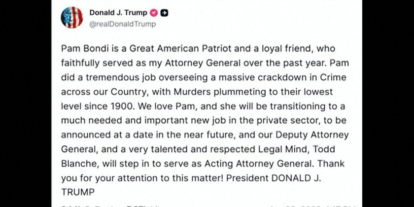 Trump wrote on Truth Social. "She will be transitioning to a much needed and important new job in the private sector, to be announced at a date in the near future." Trump's latest statement came shortly after multiple U.S. media outlets reported that the president had fired Bondi.