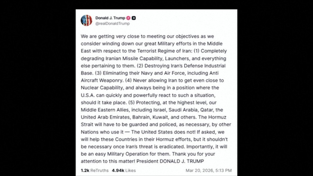 The objectives Trump outlined include degrading Iran's missile capabilities, destroying its defense industrial base, eliminating its navy and air force, preventing it from ever approaching nuclear capability and protecting U.S. allies across the region.