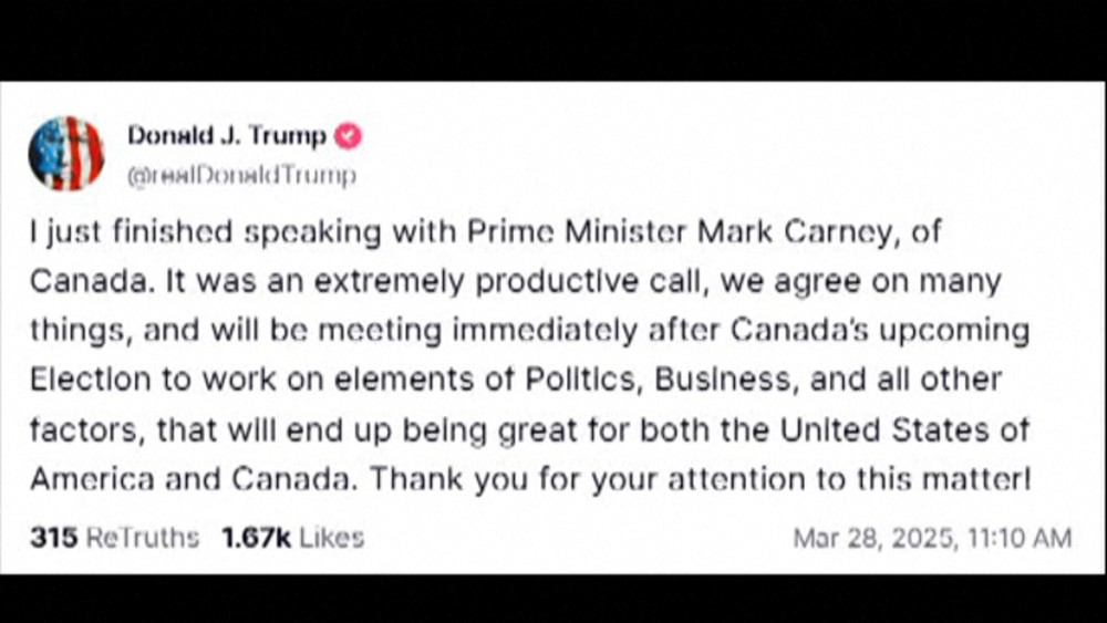 Trump wrote in a post on Truth Social, that "they agree on many things, and will be meeting immediately after Canada's upcoming Election to work on elements of Politics, Business, and all other factors, that will end up being great for both the United States of America and Canada."