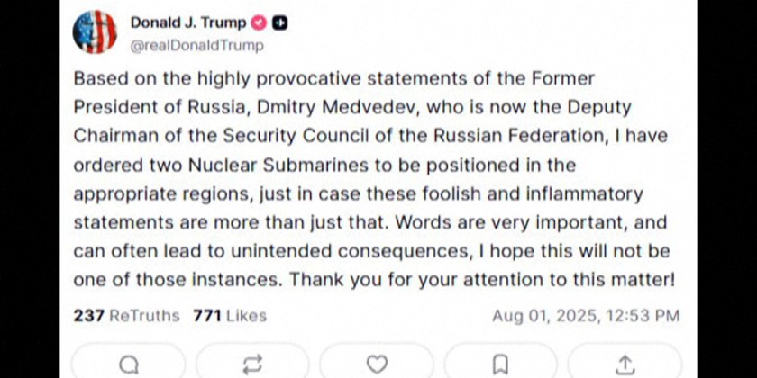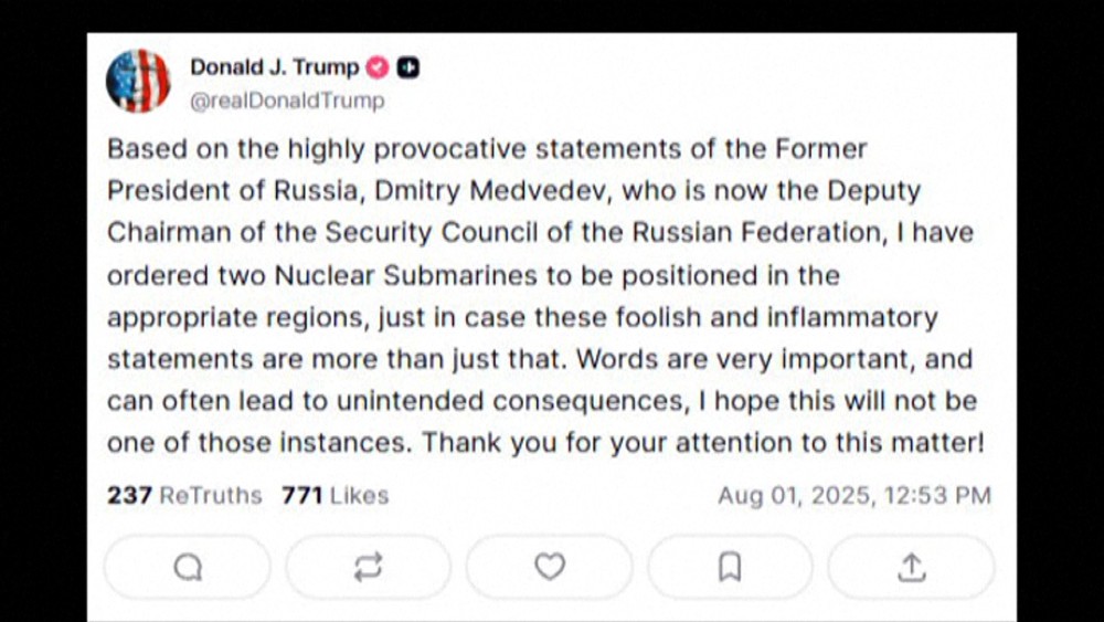 Trump wrote on social media on Friday that he made the order based on "the highly provocative statements" of Medvedev, who is now deputy chair of Russia's Security Council. The US president has not specified where exactly the two ships will be deployed or which of Medvedev's comments he considered provocative.