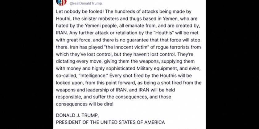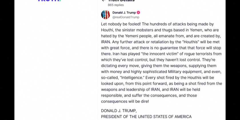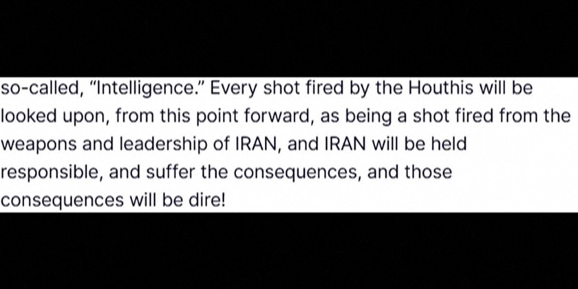 U.S. President Donald Trump on Monday warned that Iran will suffer dire consequences for further attacks by the Houthis based in Yemen. "Every shot fired by the Houthis will be looked upon, from this point forward, as being a shot fired from the weapons and leadership of IRAN," Trump wrote on Truth Social.